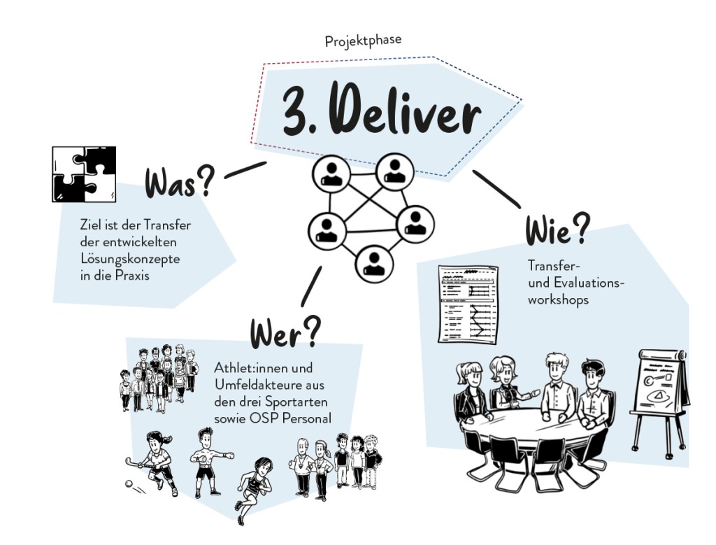 Let’s make it happen – In der DELIVER-Phase sollen die gemeinsam entwickelten Lösungen und Konzepte in der Praxis umgesetzt und langfristig verankert werden. Dafür finden Transfer- und Evaluationsworkshops mit den Beteiligten statt.